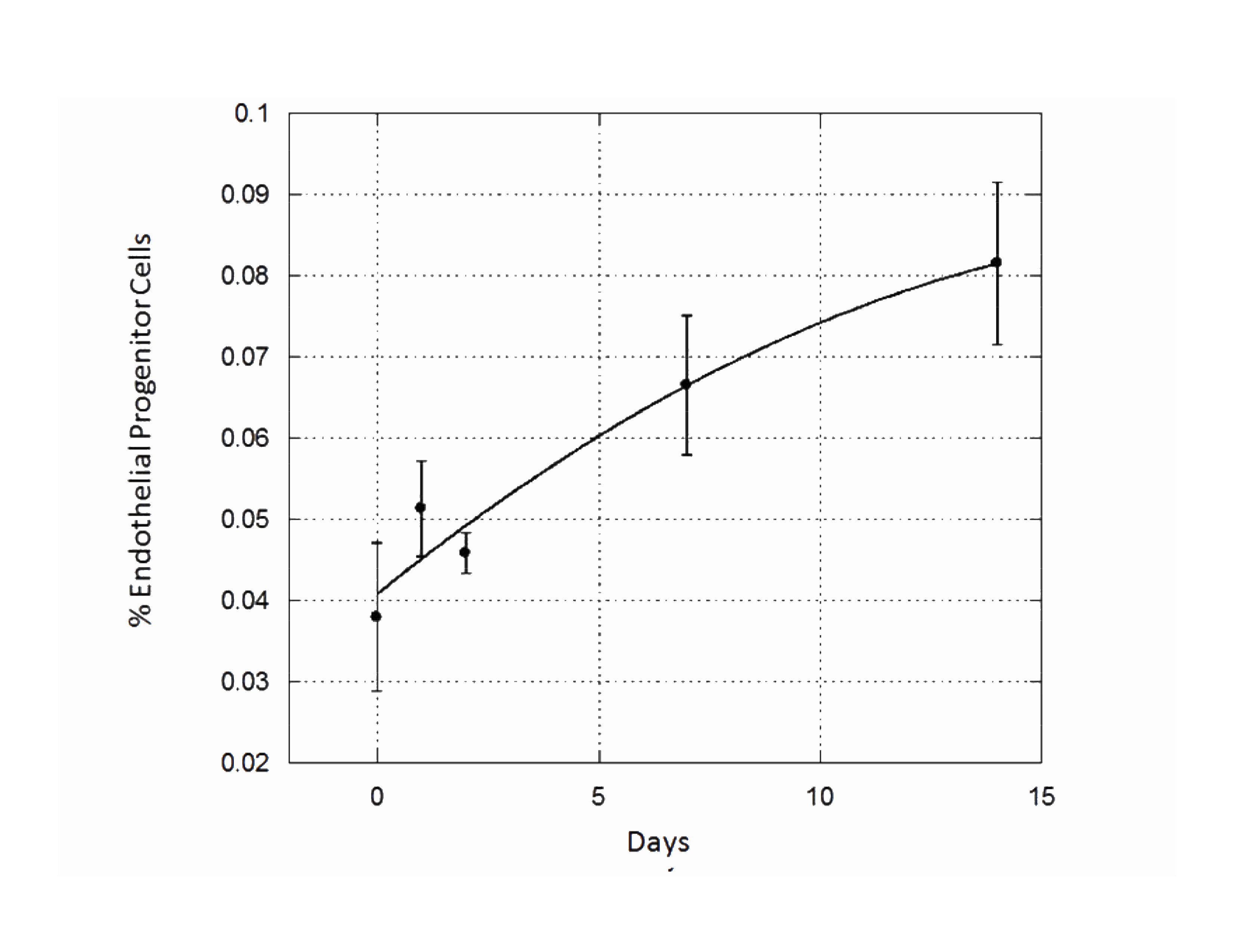 このことから、流血 中の血管内皮前駆細胞 (EPCs: 血管新生や血管修復にかかわる幹細胞)の数が平均 2 倍まで増加したことがわかる。