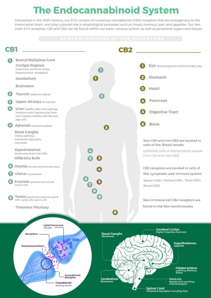 内在性カンナビノイド系は、記憶を形成し、運動機能を制御し、痛みを処理し、そして気分および睡眠に影響を与えます。これらは有機受容体で構成され、体の至る所に存在しています。