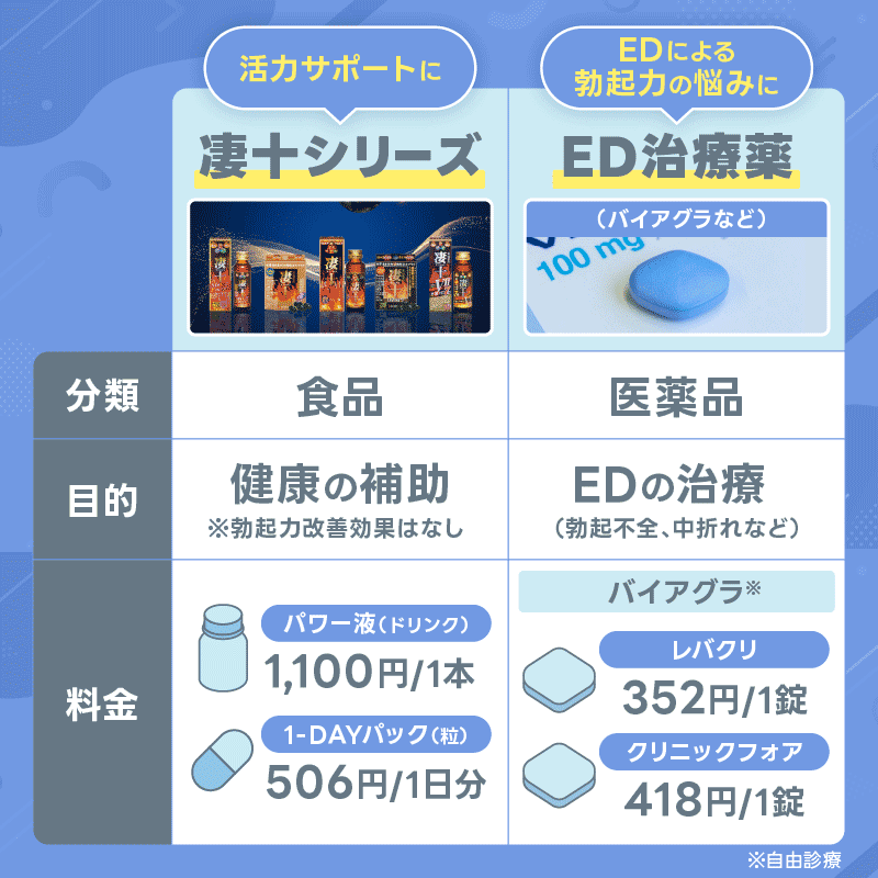 ED(勃起不全)など勃起力に悩みがある人は、精力剤ではなくバイアグラなどのED治療薬がおすすめです。